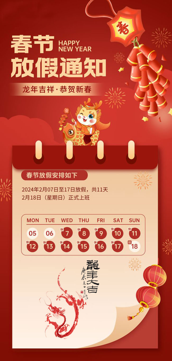 具體放假時間為:2024年2月7日-2月17日放假,共11天,2月18日(星期天)正式上班。放假期間網站問題電話或微信反饋,我們第一時間處理,電話:15399213588(同微信)